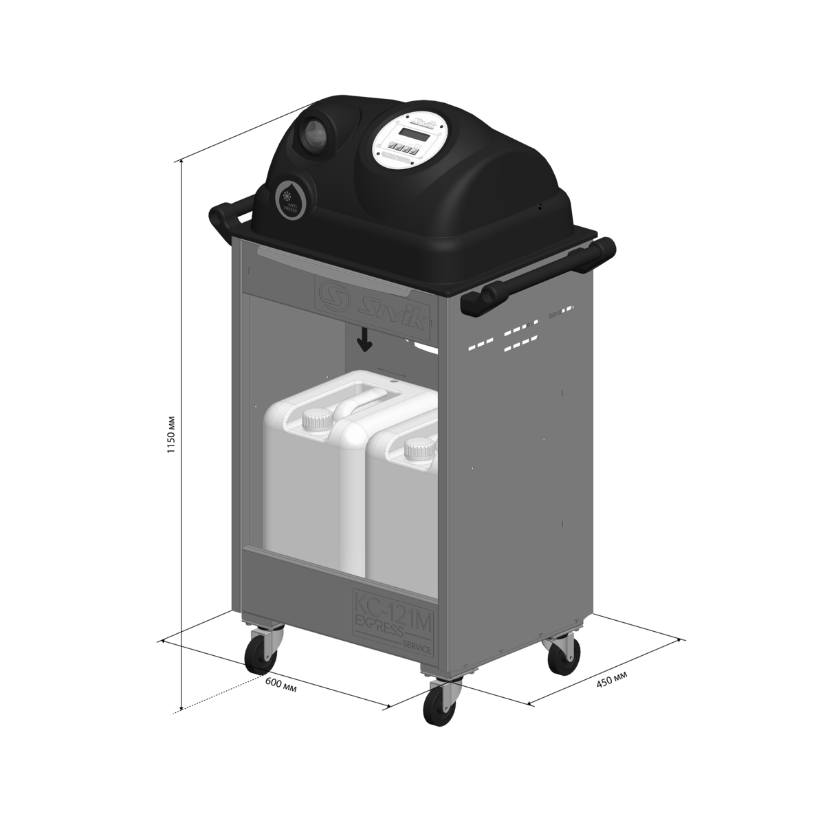 Соединение КС-121М с системой охлаждения автомобиля осуществляется через специальные адаптеры, которые входят в комплект поставки. Для правильной работы установки необходимо убедиться в корректности подключения через индикатор потока жидкости, который должен вращаться по часовой стрелке. Ошибочное соединение не приведет к повреждению авто или оборудования, но потребует переподключения. Забор новой жидкости осуществляется из любой внешней емкости. В комплекте с оборудованием поставляются вместительные канистры, которые удобно размещаются в специальной нише.